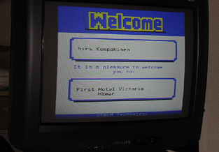 jotta hän saa sen sitten siirretyksi huoneen telkkariruutuun tervetulotoivotukseksi. Esitän, että hän toivottaisi