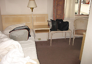 Kurvaan siistin näköiseen hotelliin. Kyllä, yhden hengen huoneita löytyy, ja voi tupakoida. Kysyn hintaa. Tyttö