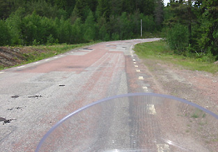 Ennen Drevsjötä tie muuttuu kuoppaiseksi, ja tärähtelyt välittyvät istuimen putken kautta kipeinä suoraan häntäluuhun.