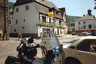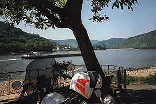 13.6.1989 Tutkailen ensi töikseni oloani ja vakuutun siitä, että joku on syönyt kissanpaskan minun suullani. No, käännetään vielä hetkeksi kylkeä. Päätän lopettaa teltan mukana raahaamisen. Vien sen postiin ja lähetän kotiin; saavatpahan tuliaisia Saksasta. Makuupussin pidän kuitenkin, siinähän nukkuu hätätilassa vaikkapa ilman telttaakin. Paluumatkalla hotelliin poikkean huoltiksella. Jawohl, totta kai öljynvaihto onnistuu vaikka saman tien. Sanon, että ajattelin kyllä öljynvaihtoa lähinnä Guzzille - en niinkään itselleni - ja että haen pyörän hotellin parkista. Homma on vartissa selvä. No problem, mein Herr. Lasku kirjoitetaan ainoastaan öljyn ostohinnasta. Kyselen Guzzilta, mihin päin tänään lähdetään. Vai että Moselille viinejä maistelemaan. No, mennään vain, mutta ei kai sitä herran tähden taas tänäkin iltana - juuri kun elämä on päässyt voitolle. Reinin mutkan oikaiseminen tuntuu hyvältä ajatukselta, joten ajelemme yhdessä suoraan Mannheimin sivuitse E 31:lle - Guzzi ja minä. Kolmesta kaistasta keskimmäisellä tuntuu olevan passeli 120 - 130 km/h nopeus. Yht'äkkiä tapahtuu jotain, mikä saa sydämen pomppaamaan kurkkuun. Vasenta kaistaa puhaltaa ohi viisi sotilaskuorma-autoa ainakin puolta toista sataa. Koneet huutavat ja renkaat lätisevät infernaalisesti. Olisivatko nämä niitä kuuluisia Naton nopean toiminnan joukkoja? Oli tai ei, taitaa illalla olla housupyykki odottamassa. No, siihen saakka ei ainakaan kalsareiden takasauma pahemmin hankaa. Ylitän Reinin Rüdesheimin - Bingenin kohdalta. Näillä kohdilla saksalaiset tekivät oikeastaan viimeistä kertaa kovaa vastarintaa liittoutuneiden joukoille keväällä -45. Vastarinnan luhistuminen merkitsi käytännössä koko länsirintaman romahtamista. Ajelen joen oikeaa rantaa Koblenziin päin ja melkein missaan Lorelein. Se pitää toki käydä katsastamassa. Olen ymmärtävänäni opaskirjasten sanoman seuraavasti (käännöksen oikeellisuudesta vastuun kantaa lukija): Lorelei on Reinin oikealla rannalla oleva jyrkkä kallio, jonka huippu on 132 metriä joenpintaa korkeammalla. Kallio on kuuluisa 12-kertaisesta kaiustaan. Heinrich Heinen balladin Die Lorelei tunnetuksi tekemä tarina purjehtijoita laulullaan tuhoon houkuttelevasta Lorelei-neidosta kuuluu mukailtuihin reininsatuihin. Tiedä häntä. Eipä jaksa ihmeesti innostaa. Näkymiä kalliolta hallitsee vastarannan kukkulat, joista paikalliset sorakeisarit ovat käyneet jyrsimässä puolet pois. Ja aina joen puolelta. Sama on tuon teutonisen kirjallisuuden kanssa. Ainoa minulle tuttu saksalainen kirjallinen tuote on Lutherin aikoinaan Wittenbergin kirkon oveen naulaamat teesit. Jostakin minulle epäselväksi jääneestä syystä saksan kielen opettajattaremme piti niiden lukemista elintärkeänä saksan kielen ja maan kulttuurin ymmärtämiselle. Tämä mieltä kaihertava kokemus varmasti ainakin osaltaan selittää omaa ambivalenttia suhtautumistani Saksaan ja saksalaisiin. Koblenzissa ajan harhaan. Guzzi tuntuu kumman haluttomalta vetämään. Etsin syytä moiseen ja huomaan meidän kiipeävän koko ajan ylöspäin. Ei ihme, ettei veto tunnu oikein maistuvan. Olemme hivuttautumassa ylös Reinin liuskevuorten rinteitä, ja Guzzihan nimenomaan halusi Moselille. Kiusaan poloista hetken ja käännyn sitten takaisin. Illansuussa tullaan Klotteniin. Pysähdyn Moselin rantaan ja istun penkille tupakoimaan. Ohi ajelee hissun kissun jokilaiva, jossa näkyy olevan hiilikuorma päällä. Varmaankin käypäisiä kuljetusreittejä nämä Keski-Euroopan joet. Laivan keulassa istuu koira sen näköisenä, että pois tieltä, täältä tullaan. Vaikuttaa siltä, että luffe on mukana ainakin perämiehen vakanssilla. Metka näky! Muistelen mielessäni tarvittavat hotelliinkirjautumisfraasit saksaksi ja kävelen vastapäiseen Gasthauseen esittämään ne.