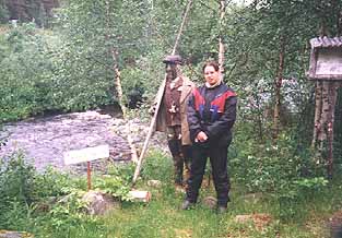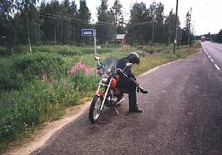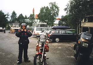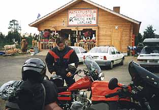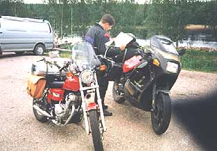 22.7.1998 Emme aamulla turhaan hötkyile tien päälle. Eikä ole mitään syytäkään, sillä emme vielä tänään tavoittele Nordkappin maisemia. Mutta mentävä sinne kuitenkin on, jos mennä meinaa. Pari kilometriä mummolasta ylöspäin, siinä tullin paikkeilla, kuulen vaimon huutavan, että "et sitten ajata sitä poikaa hengiltä". En oikein pääse selvyyteen, tuleeko ääni kypärän sisältä vaiko ulkoa. No, joka tapauksessa, merkitään tuokin tiedoksi. Haetaan taas ensin ajorytmiä. Mikko ajelee keulilla ja määrää tahdin. Jätän välin melko pitkäksi ja tuleskelen hissun kissun omaan tahtiini. Kai se on minunkin ymmärrettävä, että pojan pitää saada itse kantaa vastuu ajamisestaan. Enhän minä voi miksikään päällystakiksi ruveta. Ongelma on nimenomaan minun, ei Mikon. Kolarin Shellillä pysähdymme pikku paussille. Ilmassa on sen verran lämpöä, että päätämme ostaa jätskit. Mikko kyselee, onko ajonopeus sopiva. No, onhan se Bemarille vähän alakanttiin, mutta eipä hätää. Nyt mennään näin. Sanon Mikolle, että hän saa ajella edelleenkin nokkamiehenä, jonka vastuulle kuuluu aina myös oikean tienreiän hakeminen. Mikko ihmettelee, että mistä hän nyt senkin voi tietää. Lyön kartan kouraan, että tutkipa tuosta. Hettaan menevästä tienhaarasta Palojoensuussa pitäisi hoksata kääntyä. Mikko mutisee, että pakko kai se sitten on. Sanon vielä, että minä saatan tulla sen verran perässä, että peileistä ei näy. Ja myös, että aion pysähtyä Kihlangissa tienvarren koskipaikassa katsastamassa, vieläkö siinä joku yrittää narrata lohta. Niin, että senkään ohi ei nokkamiehen oikein sopisi ajaa. Seuraa hetki harrasta kartanlukua, jonka jälkeen Mikko pistää kypärän päähänsä, hanskat käteen ja nousee pyörälle. Ottaa sitten hanskat ja kypärän pois ja huutaa, että mikä sen paikan nimi taas olikaan, jonka ohi ei sopinut ajaa. Ehti jo unohtua. Huudan takaisin, että Kihlanki. Saapa nähdä, osutaanko samaan paikkaan pysähdyksiin. Osutaan. Ja onhan siellä muutama sinnikko veneineen vielä onneaan kokeilemassa, vaikka paras lohennousu onkin jo pari viikkoa takanapäin. Seurailemme soutumiesten touhuja jonkin aikaa, mutta mitään mainittavaa ei näytä tapahtuvan. Esittelen vielä toisilleen Mikon ja Pakajoen vonkamiehen; puupökkelöstä tehdyn patsaan, joka tuntuu taas saaneen uudet vaatteet päälleen. Kukahan sen pukemisesta täällä oikein huolehtii? Muoniossa tankataan. Ehdotan Mikolle, että kahvipaussi voitaisiin pitää Sonkamuotkassa. Mikko hakee Sonkamuotkan kartalta ja sanoo "joo". Sonkamuotkan matkamuistomyymälässä onkin uusi tuttavuus; paksu tyttö, joka näyttää palvelevan muita asiakkaita aivan asiallisesti, mutta joka on jostain saanut päähänsä, että motoristeja kuuluu puhutella oikein tosi rempseästi. Kun tulen kuuloetäisyydelle hän, roolinsa tehosteeksi, kirota pärskäyttää aputytölle jostakin asiasta.