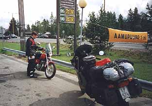 26.7.1998 Käppäilemme Riekonkiepin ravintolaan aamupalalle. Ollikin sinne ilmestyy tuota pikaa. Kenelläkään ei ole sen valmiimpaa kiirettä mihinkään, joten istutaan nyt ja poristaan mitä mieleen juolahtaa. Mikko kyllästyy ensimmäisenä ja ehdottaa, että lähtisimme liikkeelle. Pakkaamme kamppeemme ja käymme vielä vastaanotossa kiittämässä yösijasta. Lupaamme käyttää liikkeen palveluita vastaisuudessakin. Pysähdymme Vuotsossa. Mainitsen Vuotson Porokylän Kaamasen Kievaria ja Ranta-Marin baaria vastaavaksi kulttipaikaksi. Mikko kysyy, että onko tuolla aidassa todellakin poroja. Kulttiasiat eivät nyt vain tunnu kiinnostavan. Peurasuvannolla pysähdymme kahvilla. Katselemme kahvion patiolta, kuinka synkän näköisenä Kitinen virtaa; aivan kuin se ilmellään vieläkin protestoisi Lokan ja Porttipahdan tekoaltaiden rakentamista vastaan. Turistivirta tiellä on keskeytymätön. Raudanjoella Mikko alkaa purnata liian tiheistä pausseista. No, mutta enhän minä niitä tarvitse. Äidin käskystä kai tässä huilaillaan. Mikko on sitä mieltä, että jospa tästä nyt kuitenkin yritettäisiin suoritua ihan vain kaksistaan sen mukaan, miltä tuntuu. Hyvin sanottu! Napapiirin Shellillä tankataan. Ilmassa on vahva sateen tuntu. Mutta kun tässä on saatu päivätolkulla olla mitä parhaassa kesäsäässä, niin asialle ei viitsi korvaansa lotkauttaa. Muurolassa ajamme ukkoskuuroon. Taivas aukeaa, ja vettä tulee kaatamalla. Sen verran kuitenkin näkee, että hissukseen pystyy matkaa jatkamaan. Autot kyllä näyttävät pysähtelevän. Tielle kertyy niin paljon vettä, että autojen renkaat eivät sitä enää pysty syrjäyttämään - moottoripyörän kyllä. Tervolassa kuuro on ohi. Nyt aletaankin olla jo melkein kotiportilla. Kemin jälkeen panen merkille, että hyvinhän se poika jaksaa painaa. Minä jo välillä muuttelen asentoani satulassa. Kotipihalla kysyn, väsyttääkö. Eipä kuulemma juurikaan. Mikko purkaa tavaransa ja lähtee naapurin pojan kanssa lenkille. Minä oikaisen sohvalle mietiskelemään, mihin maailma oikein onkaan tullut. |