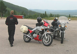 Ei vain ota silmään. Pistämme tupakaksi. Paikalle kävelee kaksi suomalaismotoristia.