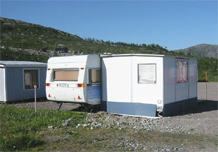 matkailuvaunujen puisia etutelttoja. Viikko sitten hiihtokeskuksen hississä on sattunut