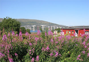 Ylitämme sillan Kvaløyalta Tromsøn saarelle. Sillasta pitää saada kuva. Hyvää kuvauspaikkaa ei vain