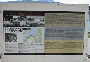 Parin pysähdyksen ja "Festung Lyngen" -esittelytauluun tutustumisen jälkeen olemme Skibotnessa. Tällä