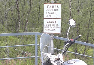 Skibotnen ja Kilpisjärven puolivälissä on kyltti, jota en ole ennen nähnytkään. Rovijokfossen ei kuitenkaan tunnu tarpeeksi mielenkiintoiselta paikalta, jotta sinne poikkeaisin. Olli ja Jaska poikkeavat. Tunnistan väsymyksen ensimmäiset merkit: en viitsi pysähtyä vetämään paksumpaa puseroa päälle, vaikka vilu alkaa karsia.