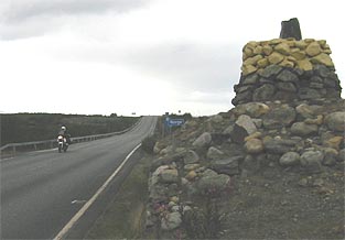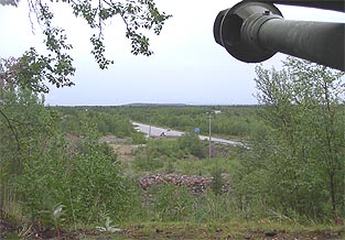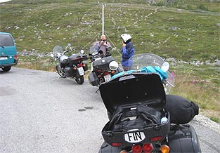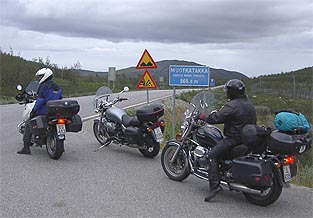 Ajelen valtakunnan rajalle ja jään odottelemaan muita. Sinimustia pilviä kiitää ylängön päällä. Vettä ei kuitenkaan tule kuin nimeksi. Jaska kurvaa rajapyykille. Sanoo Ollin vielä viipyvän. Päätämme ajella Kilpisjärven kylään. Pidetään kunnon paussi siellä, syödäkin pitää.