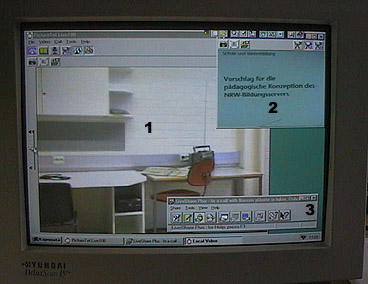 ![]() | PictureTelin kolme ikkunaa kannattaa järjestellä seuraavasti: 1. Tuleva kuva kannattaa pitää näytöllä suurimpana, jotta saa parhaan mahdollisimman käsityksen vastapään tapahtumista. 2. Lähtevän kuvan koko on riittävä kun pystyt varmistamaan, että kuvassa on juuri se informaation, jonka siinä haluat olevan. 3. LiveSharePlus on ikkuna, josta voit klikata auki mm. vastapuolen kanssa yhteisen luokantaulun - Whiteboardin. Tämä ei kuitenkaan toimi eri merkkisten laitteistojen välillä. LiveSharePlus kannattaa muulloin pitää tulevan kuvan taustalla. |
